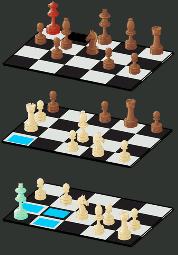 The Queen can move in eight different directions on the level she is on, she cannot jump over another piece. The Queen can slide in any direction until she reaches the desired square, the end of a level, or another piece. If the other piece is an enemy piece the Queen captures it. The Queen can also move up or down one level by moving directly to any unoccupied square on the next level. Once the Queen moves to a new level, that is the end of her turn. Like the Rook the Queen can capture a piece on the next level, only if the piece occupies the same corresponding square that the Queen occupied on the previous level. In figure below the Queen can move up one level and capture the bishop that is on the same corresponding square, in the same move.